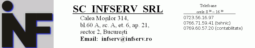 Soft pentru: evaluare economica, elaborare deviz, calcul deviz, extras resurse deviz, deviz oferta, situatie de plata, grafice retea, grafice Gant, gestiunea materialelor, contabilitate generala, salarii, mijloace fixe, colectie indicatoare, nomenclatoare, proiectare asistata, integrare colectii, integrare compartimente prin soft tip ERP prin internet, codificare si preturi unice la nivel intreprindere, servicii de mesagerie prin internet. Informatiile continute in site-ul www.infserv.ro le gasiti si in site-ul www.doclib.ro (cele doua site-uri contin aceleasi informatii). Daca site-ul www.infserv.ro nu este accesibil, incercati sa accesati site-ul www.doclib.ro. |